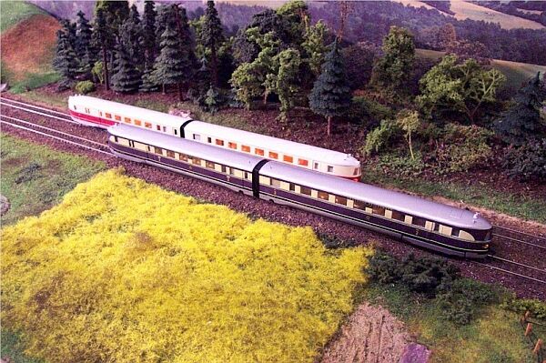 Zwei Schnelltriebwagen begegnen sich unterwegs (links DR, rechts DRG-Ausfuehrung)
